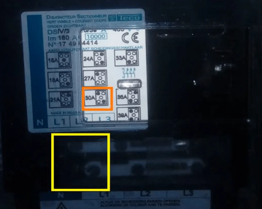 Analysez à quel dessin de domino cela correspond (carré orange). Dans ce cas, le calibre est « 30 A » (position des vis égales au schéma « 30 A »)